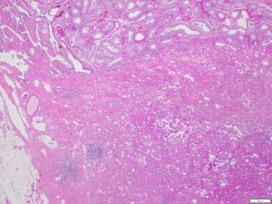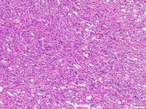 A male in his 50s presented with a right testicular mass. The mass is considered intratesticular on imaging. A right orchiectomy was performed. Macroscopic examination shows a mass that is 1.1 cm in diameter, round shaped, with well-demarcated borders and involving the tunica albuginea. A male in his 50s presented with a right testicular mass. A right orchiectomy was performed. Contributors :