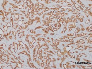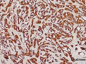 Immunohistochemical assays with appropriate controls show that tumor cells diffusely express calretinin (as shown), WT1, D240, AE1/3 (as shown), while they are negative for SMA and PAX8. These findings support the above diagnosis.