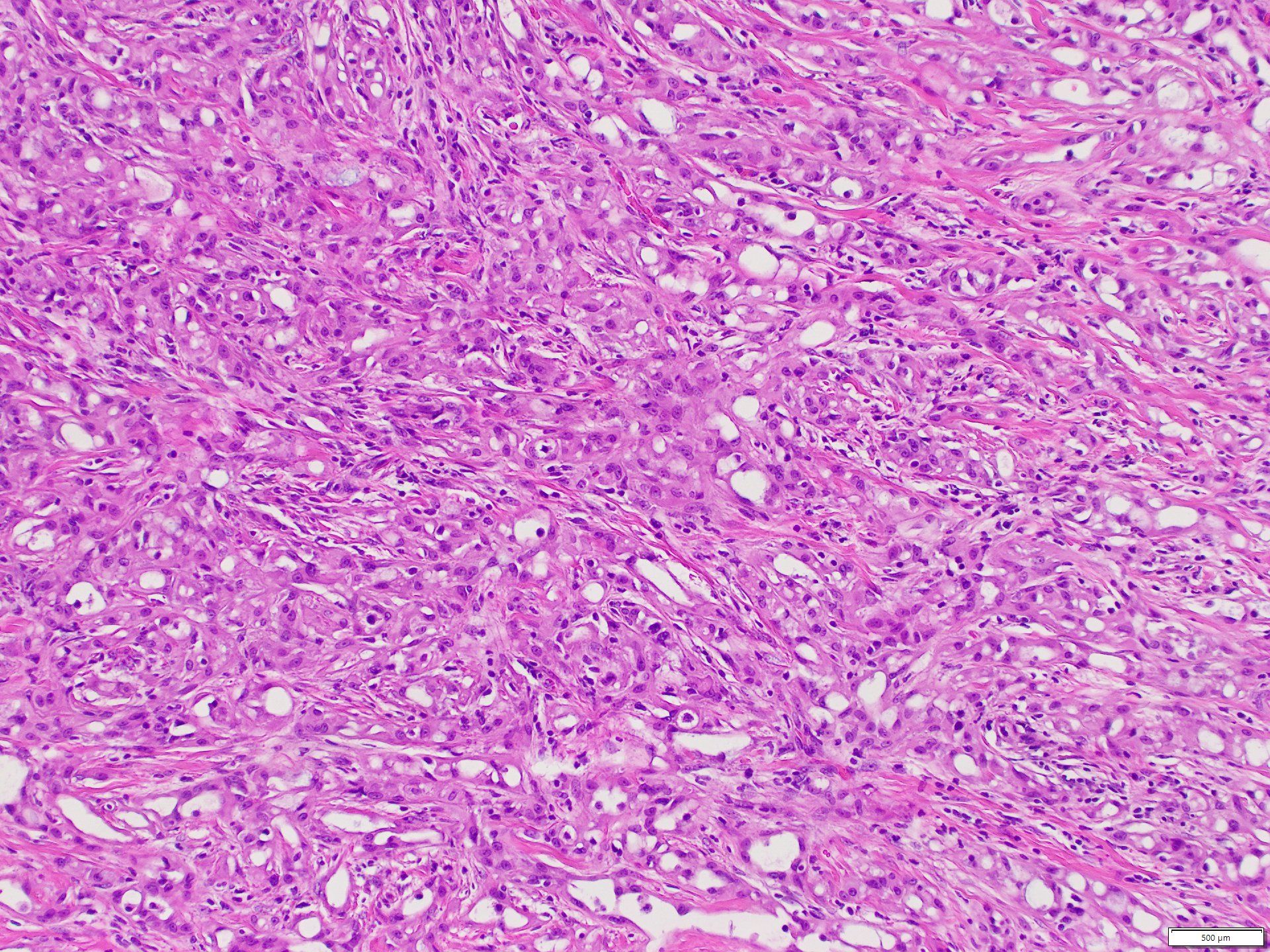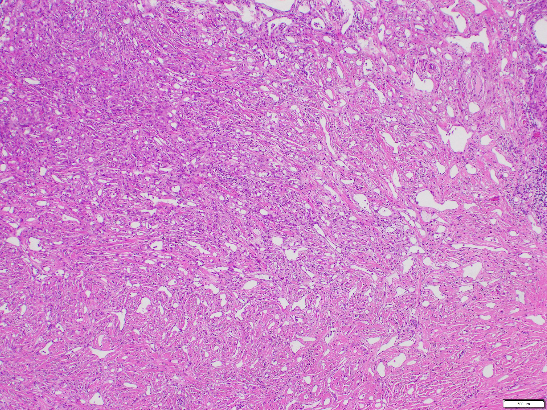 A male in his 50s presented with a right testicular mass. The mass is considered intratesticular on imaging. A right orchiectomy was performed. Macroscopic examination shows a mass that is 1.1 cm in diameter, round shaped, with well-demarcated borders and involving the tunica albuginea. A male in his 50s presented with a right testicular mass. A right orchiectomy was performed. Contributors :
