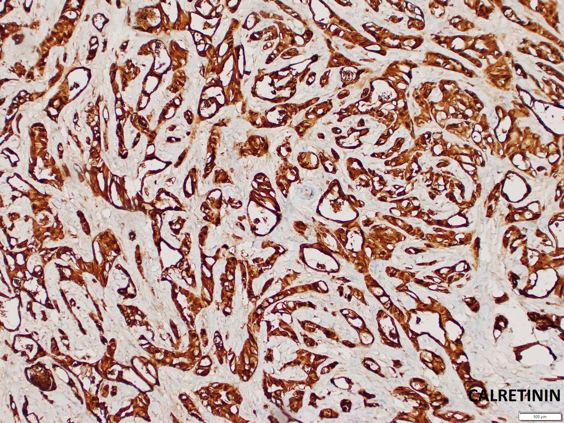 Immunohistochemical assays with appropriate controls show that tumor cells diffusely express calretinin (as shown), WT1, D240, AE1/3 (as shown), while they are negative for SMA and PAX8. These findings support the above diagnosis.