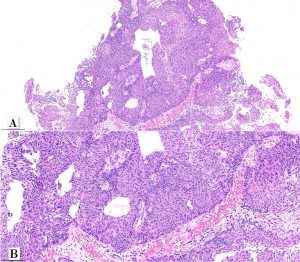 In that series, none of the cases experienced T1 stage progression and two recurrences occurred. One of the recurrent tumors was the one harboring small focus of high-grade tumor inside the primary lesion. Interestingly, the recurrent cases maintained the same whorling pattern in the second transurethral resection specimens. Therefore, although limited data on follow up is available, clinical behavior seems to be similar to low-grade noninvasive papillary urothelial carcinoma (Patriarca et al. 2014). Awareness of this morphologic subtype is important to avoid misclassification of other epithelial lesions which may show squamous or squamoid morphology.