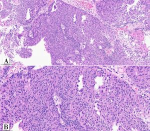 One rare morphologic subtype of in noninvasive papillary urothelial carcinoma has been described as a whorled pattern. Patriarca et al. 2014 described a series of 12 patients: all noninvasive and most of them 11/12 classified as low-grade. One patient had a tumor with mixed grade (5% of the tumor at other areas. Whorled pattern shows concentrically organized cell structures, without morphological evidence of keratinization, similar to the whorling structures of transitional meningioma.