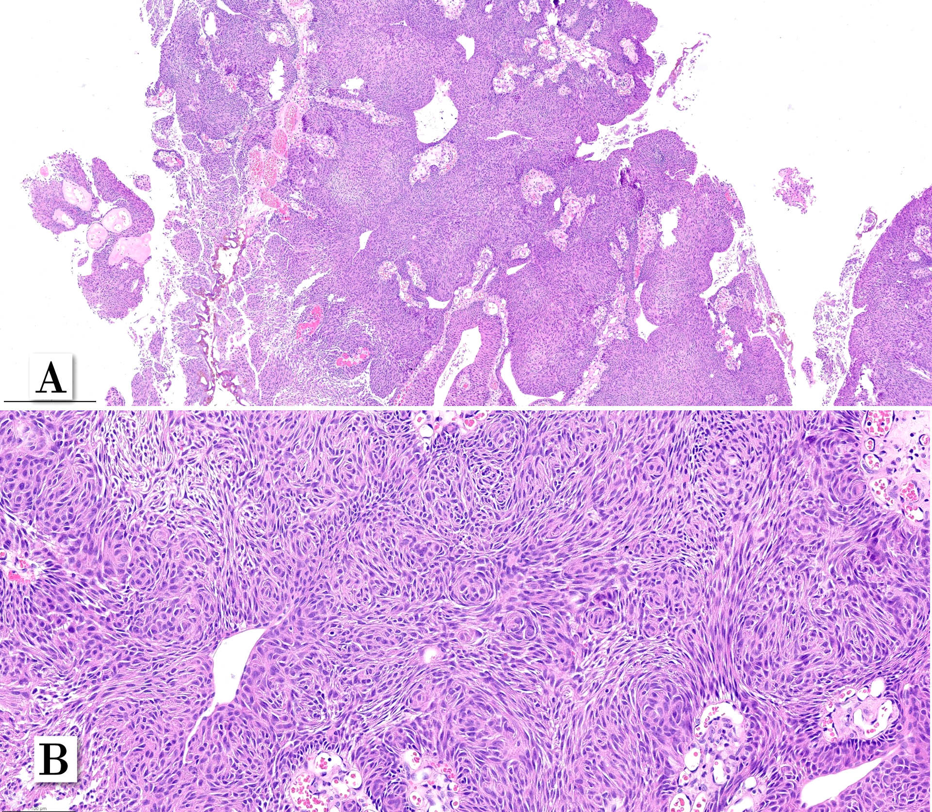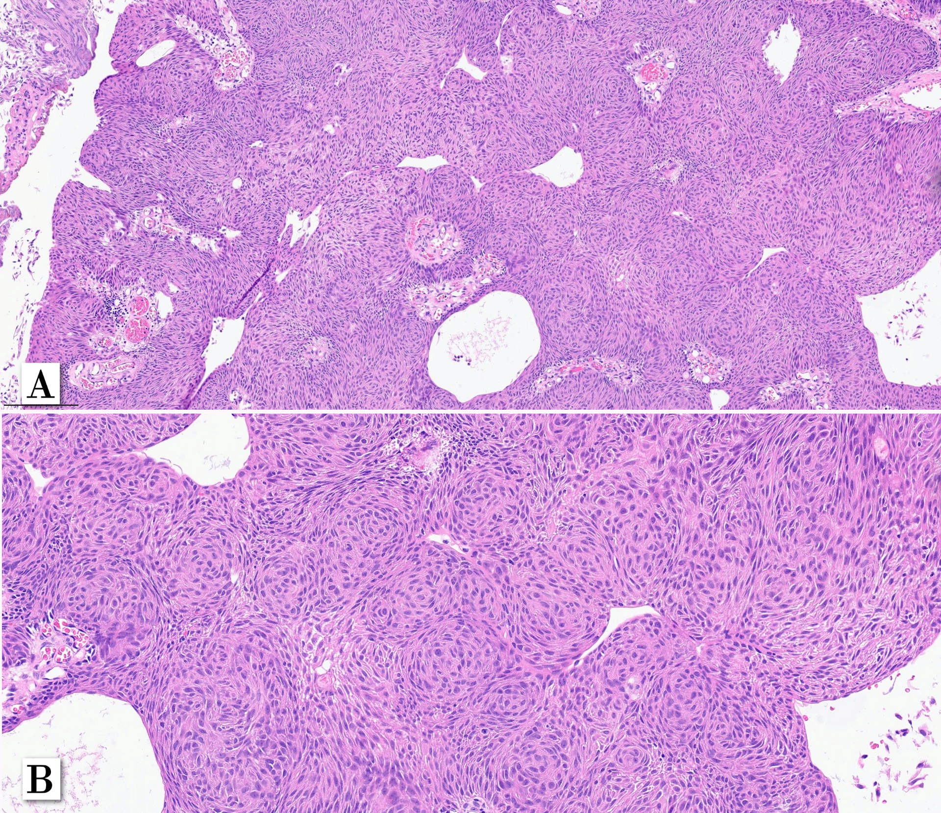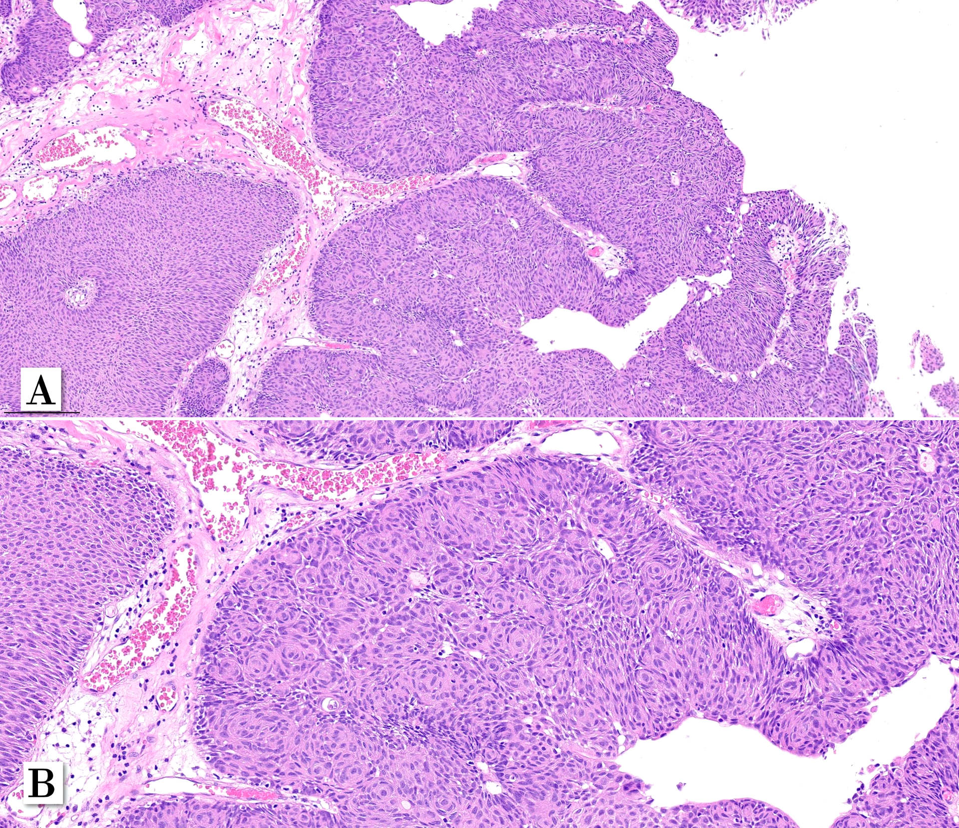 In that series, none of the cases experienced T1 stage progression and two recurrences occurred. One of the recurrent tumors was the one harboring small focus of high-grade tumor inside the primary lesion. Interestingly, the recurrent cases maintained the same whorling pattern in the second transurethral resection specimens. Therefore, although limited data on follow up is available, clinical behavior seems to be similar to low-grade noninvasive papillary urothelial carcinoma (Patriarca et al. 2014). Awareness of this morphologic subtype is important to avoid misclassification of other epithelial lesions which may show squamous or squamoid morphology.