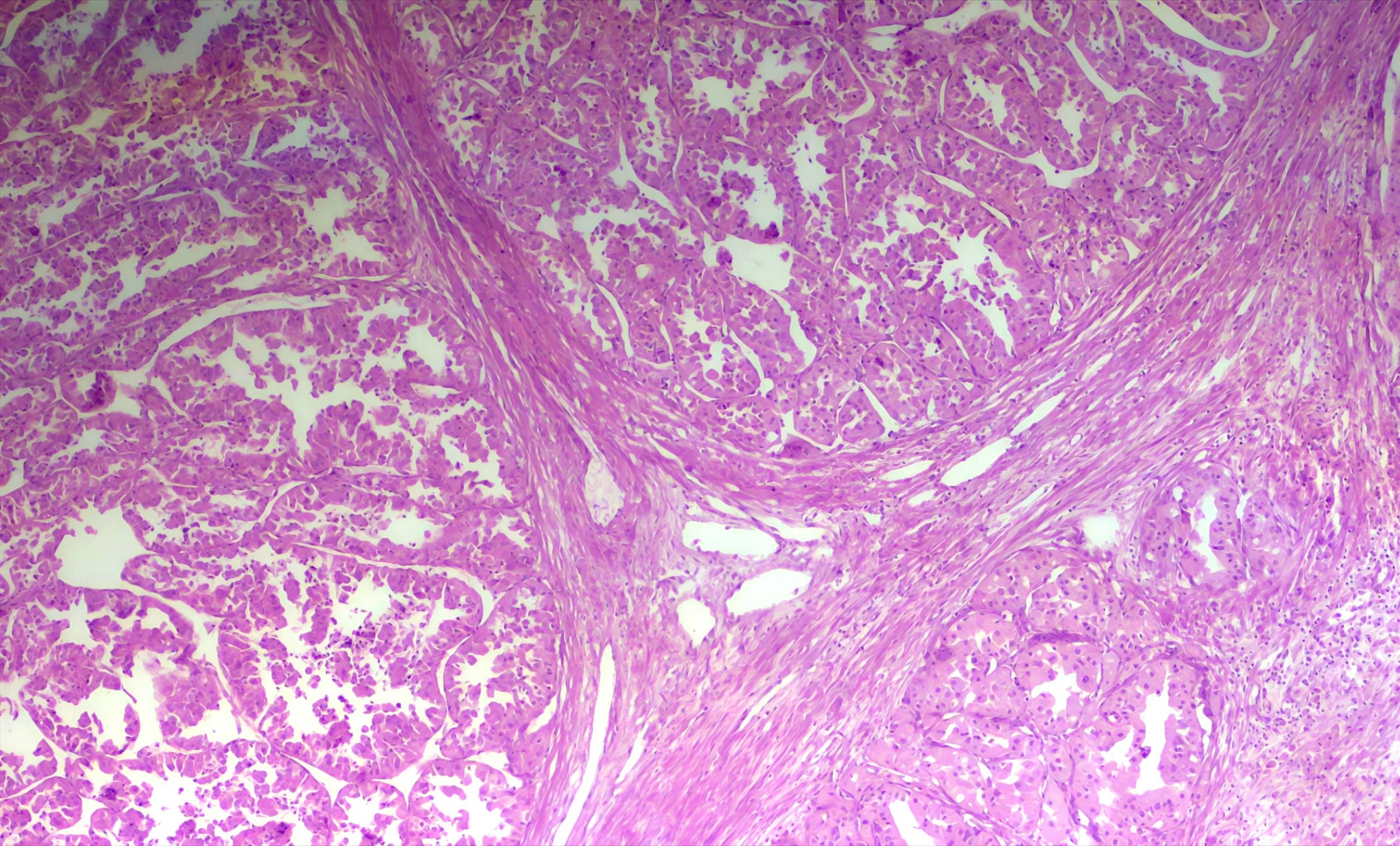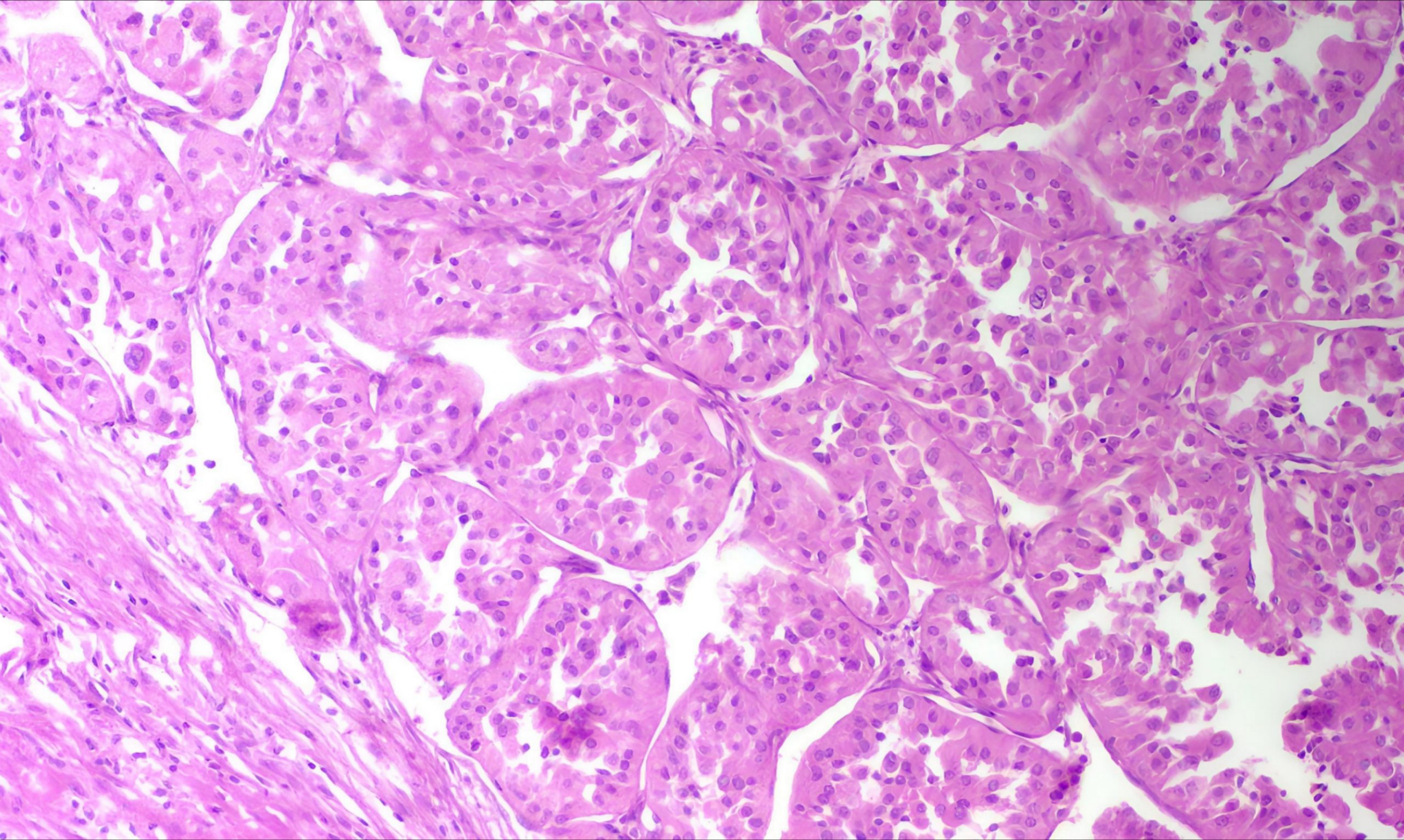 The typical histological pattern of TFE3-rearranged RCC is a papillary neoplasm made up of epithelioid clear cells with abundant psammoma bodies. These tumors can also mimic other renal neoplasms, including clear cell RCC, papillary RCC, clear cell papillary renal cell tumor, multilocular cystic renal cell neoplasm of low malignant potential, oncocytoma, and epithelioid angiomyolipoma. Some TFE3-rearranged RCCs contain melanin pigment, creating similarities with TFE3-rearranged pigmented perivascular epithelioid cell tumors (PEComas). Unlike typical PEComas, TFE3-rearranged PEComas generally affect younger patients, exhibit clear cell morphology, show minimal to no muscle marker immunoreactivity, and do not have TSC1 or TSC2 gene inactivation or an association with tuberous sclerosis.