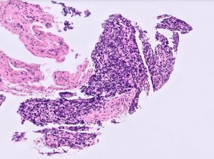 A female patient in her 40s presented with renal impairment. CT intravenous pyelography demonstrated longstanding right hydronephrosis and hydroureter with lower ureteric obstruction. At ureteroscopy there was a lesion in the right lower ureter that was biopsied (three biopsies, each 1mm). This was followed by right distal ureterectomy and ureteric reimplantation. The first four images are from the diagnostic biopsy and the last image is from the resection specimen.