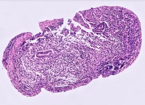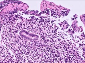 The distal ureterectomy specimen showed endometriosis with similar features to the initial ureteric bioipsy that infiltrated the ureteric muscularis propria and formed a mass undermining unremarkable urothelium. There was no evidience of hyperplasia, atypia or malignancy.