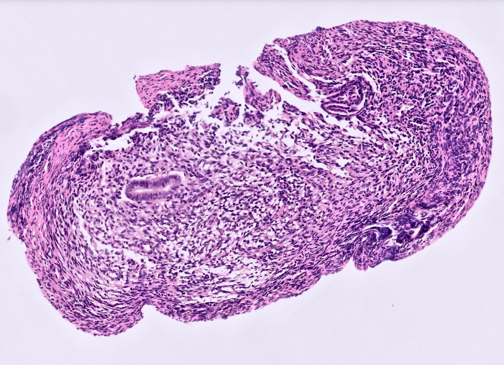 The biopsies showed small glands lined by simple columnar epithelium with cells showing basal elongated nuclei and scant apical eosinophilic cytoplasm. The surrounding stroma was cellular and composed of bland spindle cells with hyperchromatic nuclei with focal crush artefact. Keratin AE1/AE3 and PAX8 were expressed in the glandular cells only. The stromal cells were diffusely positive for CD10. ER was expressed in both glands and stroma. Neuroendocrine (NE) markers (synaptophysin, chromogranin A and INSM1), CD45, CD20, SS18-SSX and SSX-CT were negative. A diagnosis of ureteric endometriosis was rendered.