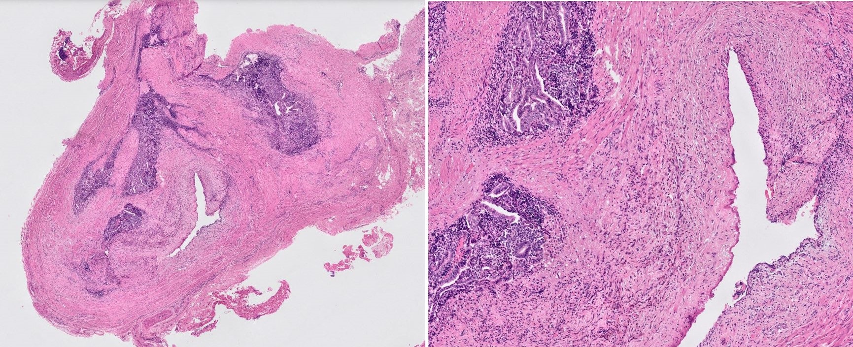 The distal ureterectomy specimen showed endometriosis with similar features to the initial ureteric bioipsy that infiltrated the ureteric muscularis propria and formed a mass undermining unremarkable urothelium. There was no evidience of hyperplasia, atypia or malignancy.