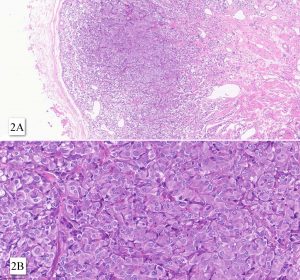 Paragangliomas of the bladder may have an epicenter in bladder muscularis propria, or in intact or ulcerated mucosa. At microscopy, the tumor shows a nested growth pattern with a Zellballen appearance. Nests are delineated by a delicate fibrovascular network and sustentacular cells. Tumor cells are round to oval may show pleomorphism or hyperchromasia. The cytoplasm may be eosinophilic or mirror the amphophilic to basophilic appearance of pheochromocytomas. Paragangliomas of the bladder usually involves muscularis propria and express GATA3 – two features that may lead to a misdiagnosis of advanced urothelial carcinoma.