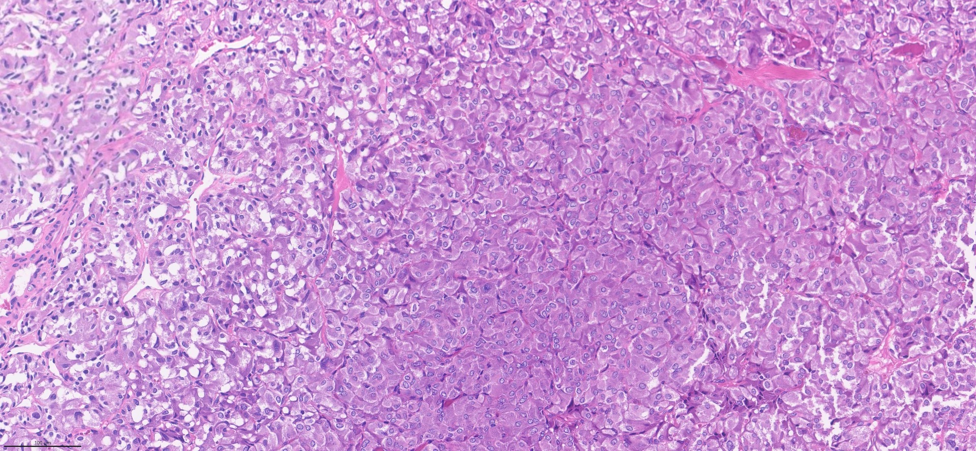 Paragangliomas of the bladder may have an epicenter in bladder muscularis propria, or in intact or ulcerated mucosa. At microscopy, the tumor shows a nested growth pattern with a Zellballen appearance. Nests are delineated by a delicate fibrovascular network and sustentacular cells. Tumor cells are round to oval may show pleomorphism or hyperchromasia. The cytoplasm may be eosinophilic or mirror the amphophilic to basophilic appearance of pheochromocytomas. Paragangliomas of the bladder usually involves muscularis propria and express GATA3 – two features that may lead to a misdiagnosis of advanced urothelial carcinoma.