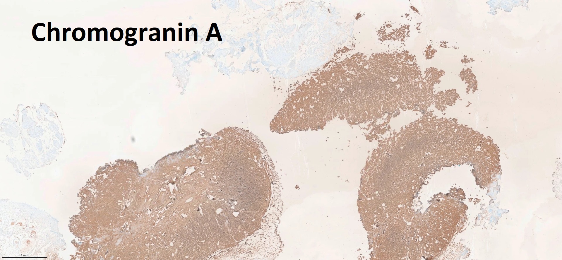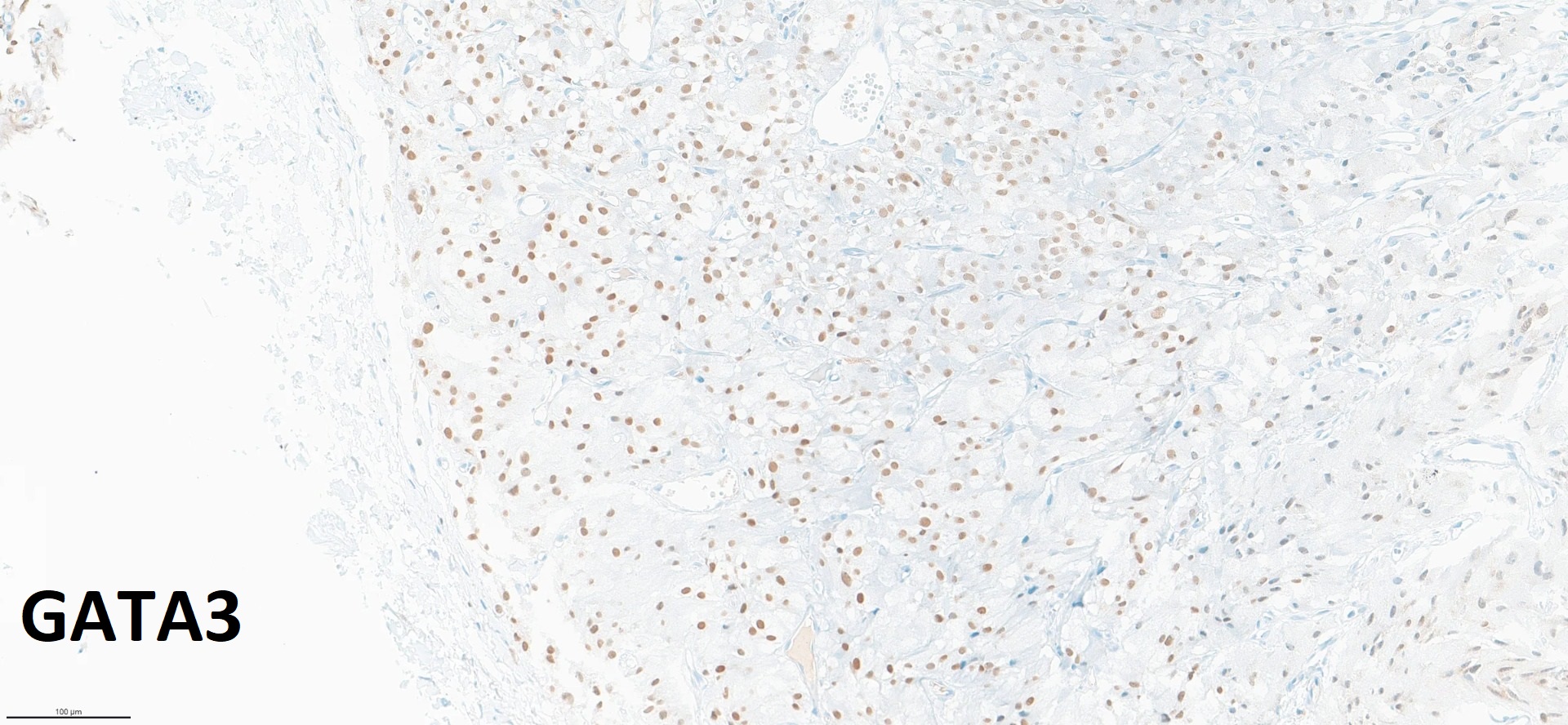 Besides GATA3 and chromogranin A expression (see figures), tumor cells were also positive for synaptophysin, S100 protein and INSM1. SDHB expression was retained. Tumor cells did not express pan-keratins, p40, p63, PAX8, CD34 and smooth muscle actin.